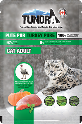 97% Pute (bestehend aus Putenfleisch, -herz, -leber, -magen, -fleischbrühe), Kürbis, Mineralstoffe (0,5%), Eierschalen getrocknet, Katzenminze